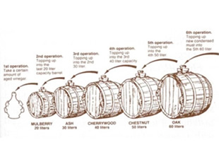 原料は組合で認証したブドウのみで、その他の添加材などは一切使用できません。製法は、先ずそのブドウを長時間煮詰めます。(煮詰める時間、温度は各生産者によって異なります)そのブドウの煮汁を冷ましたもの(モストコットと呼ばれ、この状態のものがビンコットあるいはサバと呼ばれる甘味料です)を木樽に入れて熟成させます。ある期間を経て違う樹種の木樽に移し替えます。その移し替えを何回か繰り返し12年以上の熟成を経過し組合の検査(品質、色、味わいなど)に合格することが条件です。TRADIZIONALE(伝統的)という記載が許されますが、ワンランク上質のものにはEXTRA VECCHIO(とても古い)という記載が許され、25年の熟成を経ないとこの味わいが出ないと言われています。組合では商品に熟成年数は入れませんが12年と25年熟成の2つを伝統的バルサミコとして認め、これらは組合によって瓶詰めからラベル貼りまで行い、各生産者に戻し、販売される仕組みになっています。