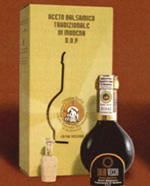 エミリア・ロマーニャ州のモデナとレッジョエミリアにおいて伝統的製法(煮詰めたブドウを木樽に移し替えながら熟成)により12年以上の熟成期間を経て作られるもので、各地域の組合での品質検査及び官能検査をクリアすることが義務付けられます。原料はブドウのみで、その品種も組合で指定されたものに限られます。組合で認定された伝統的バルサミコは決められたガラス容器に入れて商品化されます。